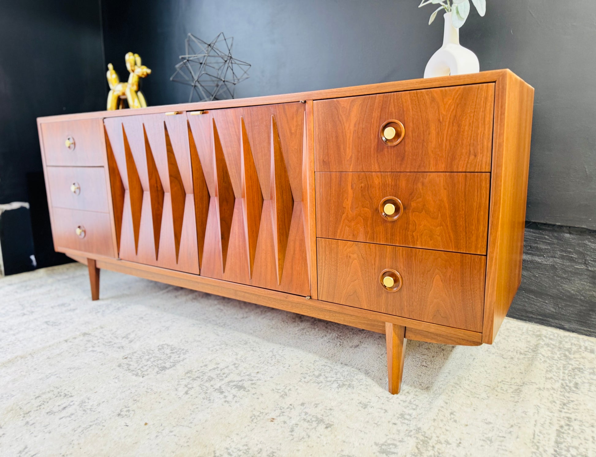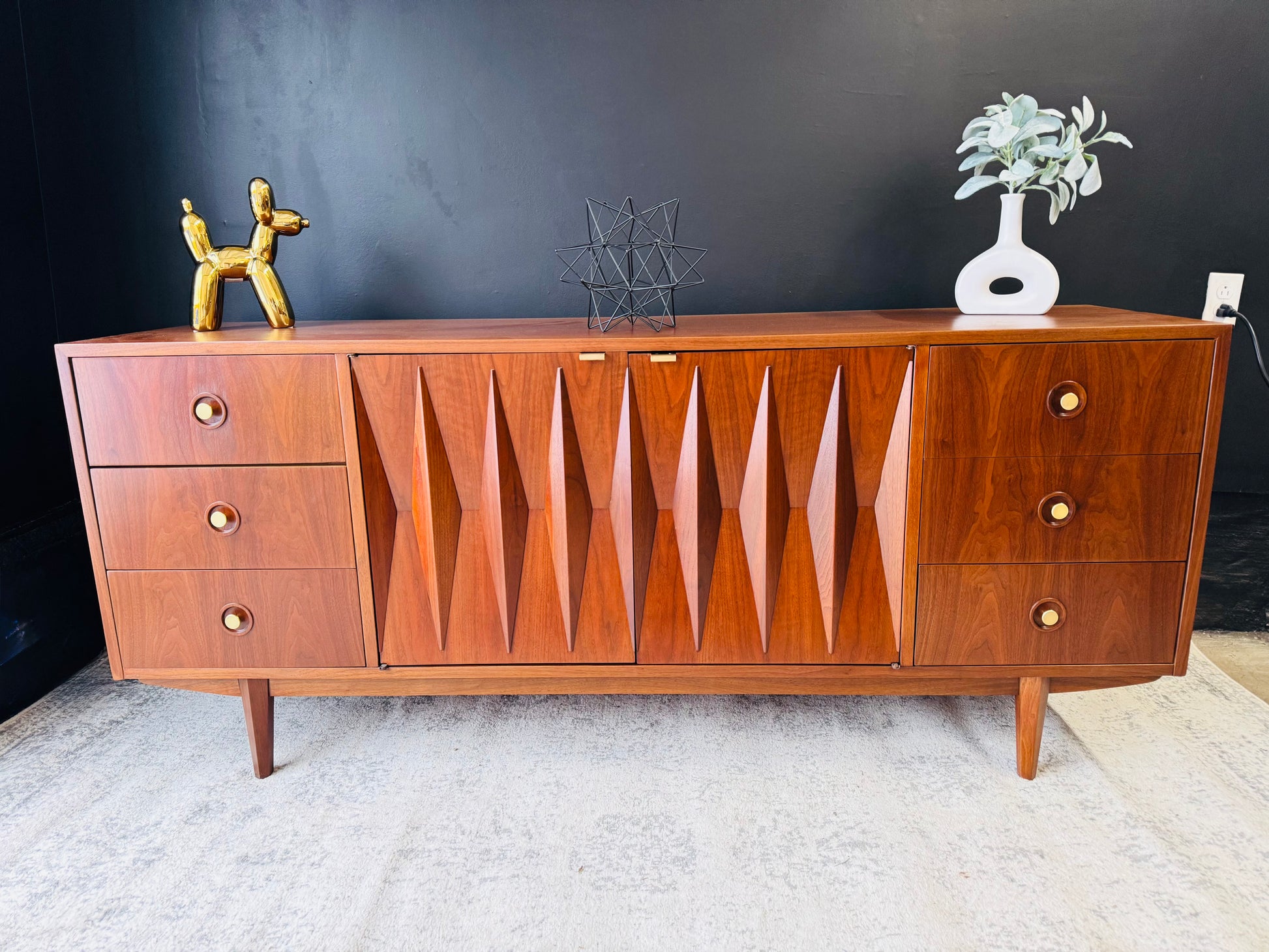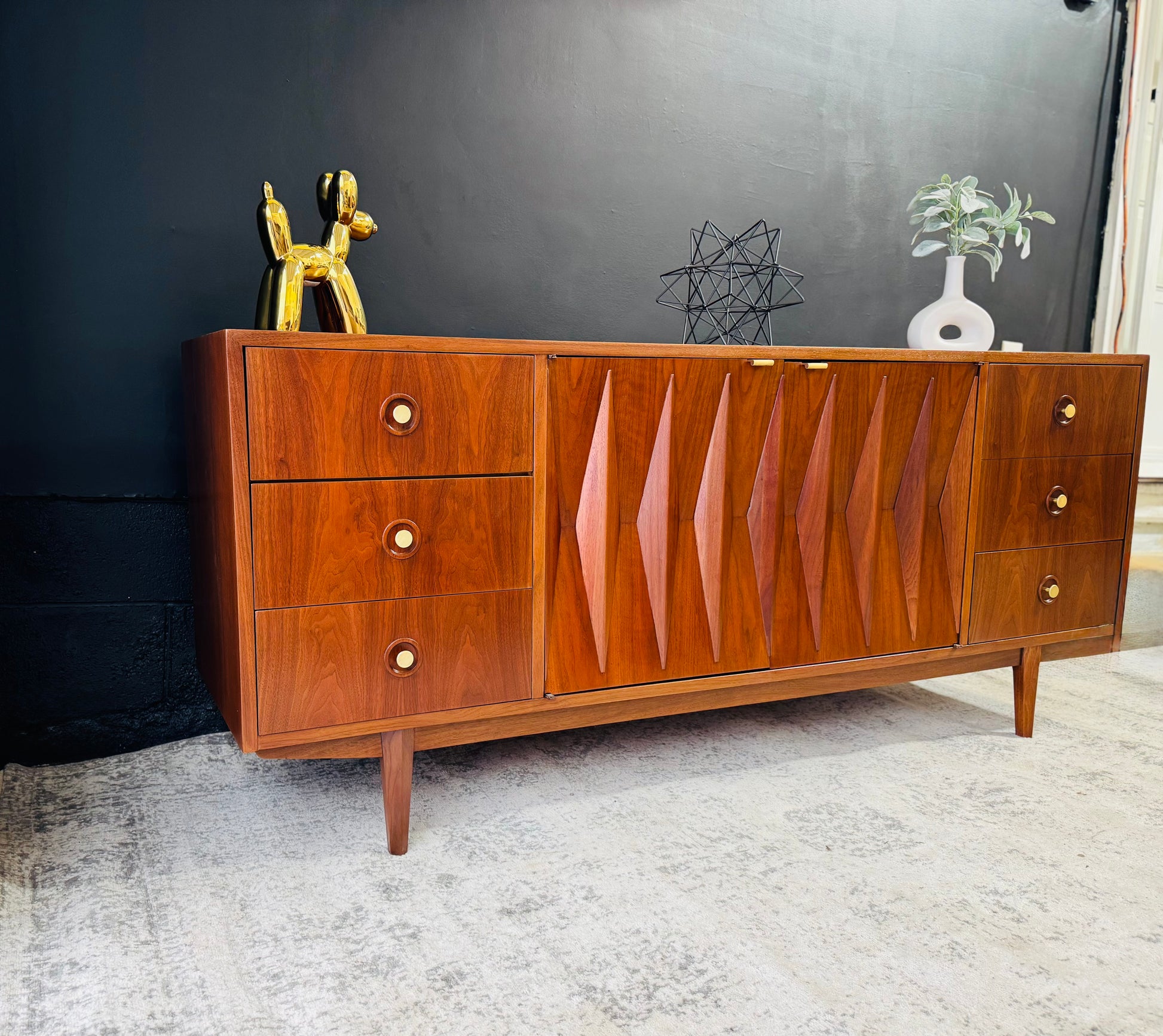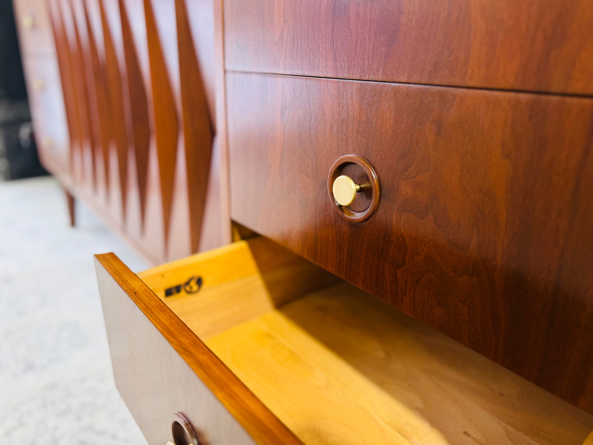 This beautifully restored 9-drawer dresser by American of Martinsville exemplifies the timeless elegance of mid-century modern design. The piece features clean lines, unique harlequin accents, and exceptional craftsmanship that make it both functional and stylish.