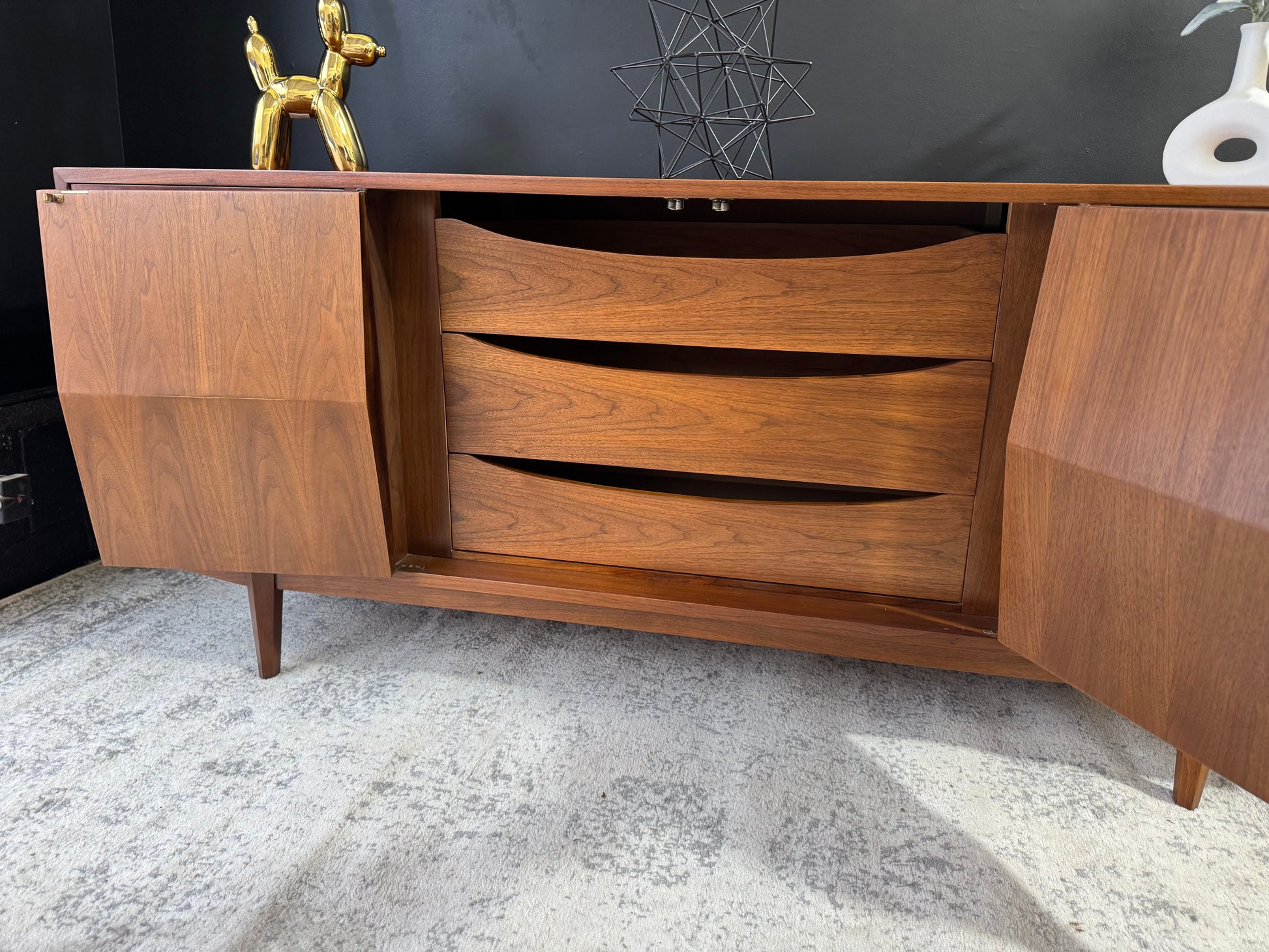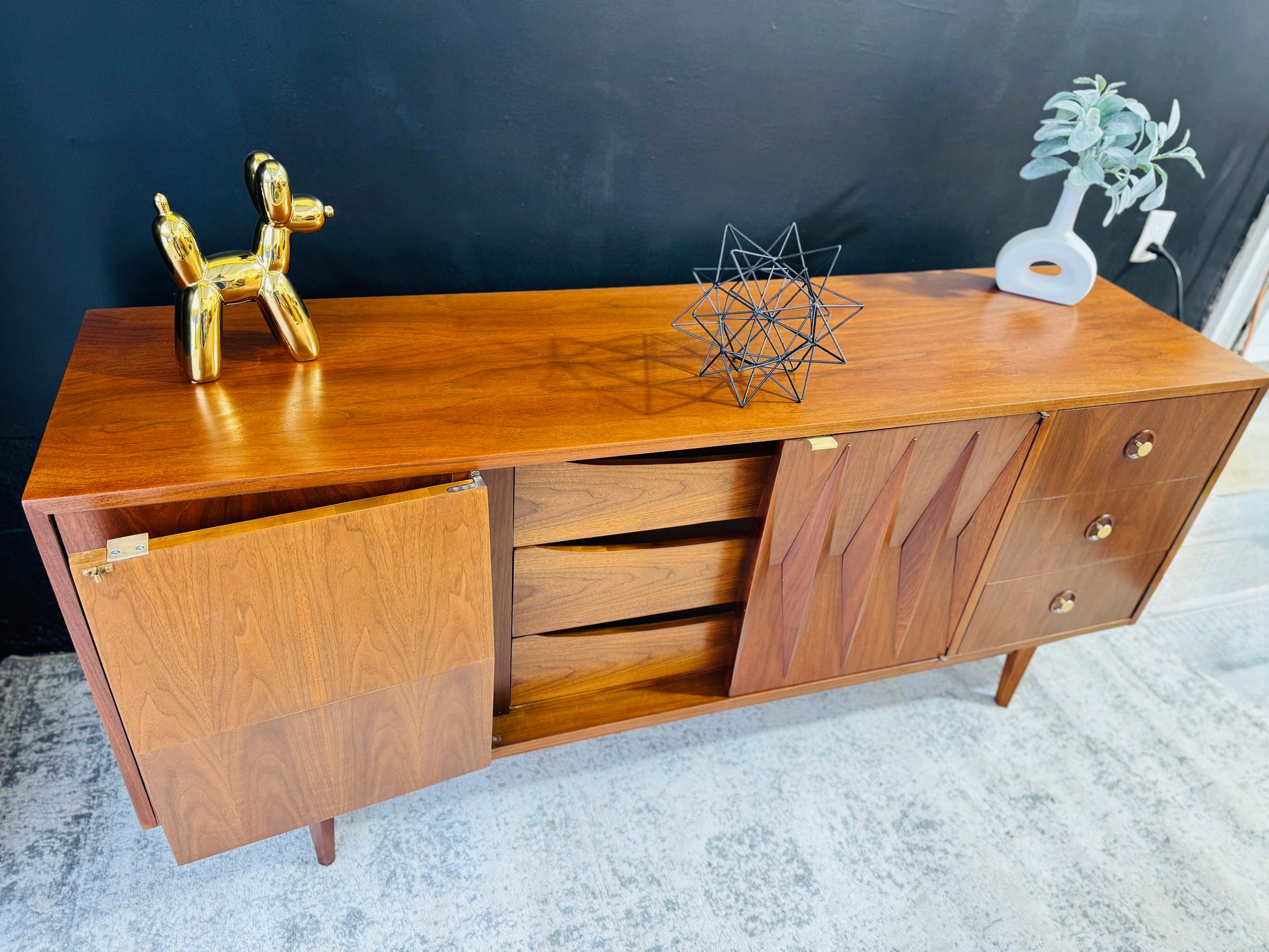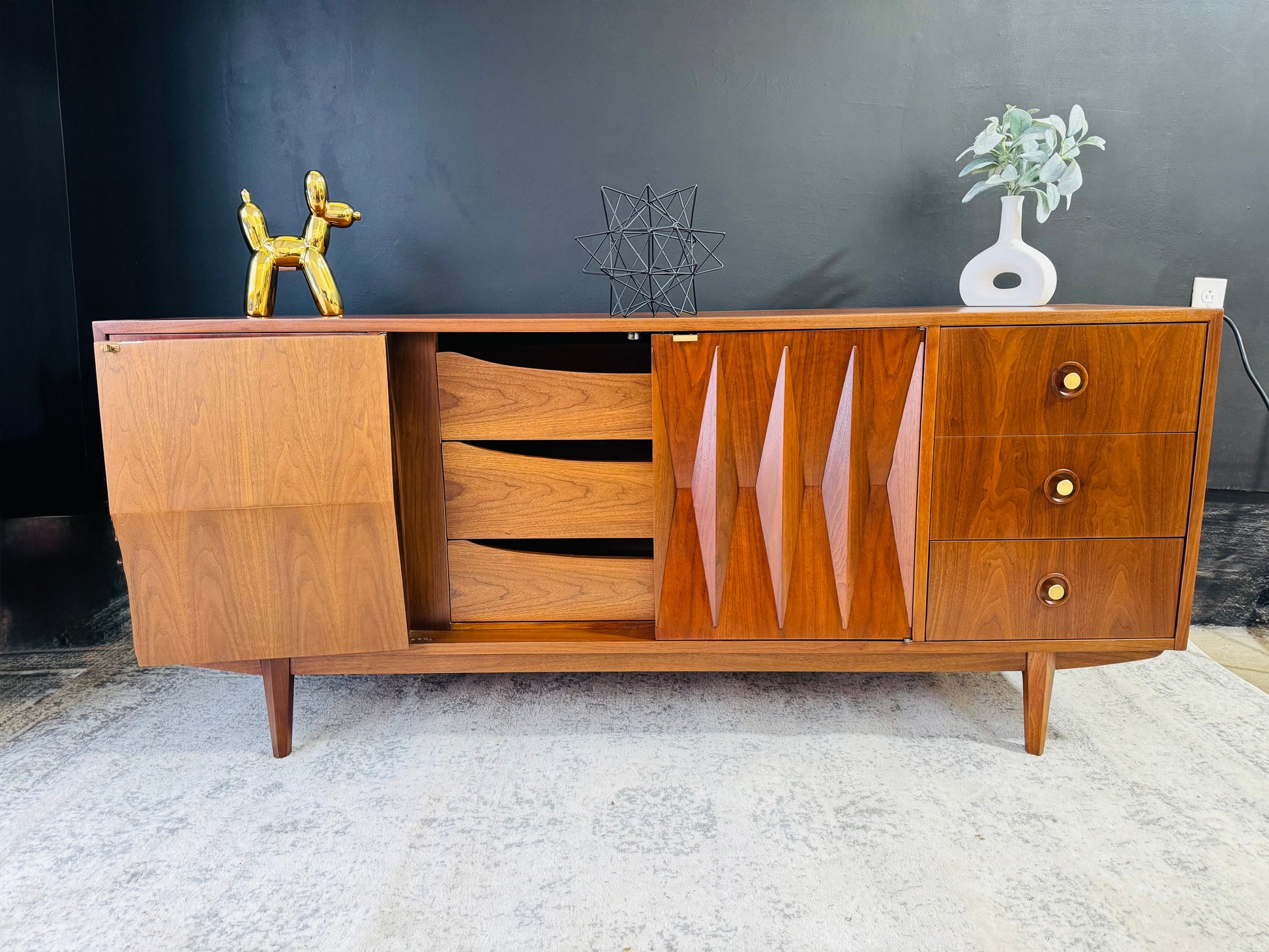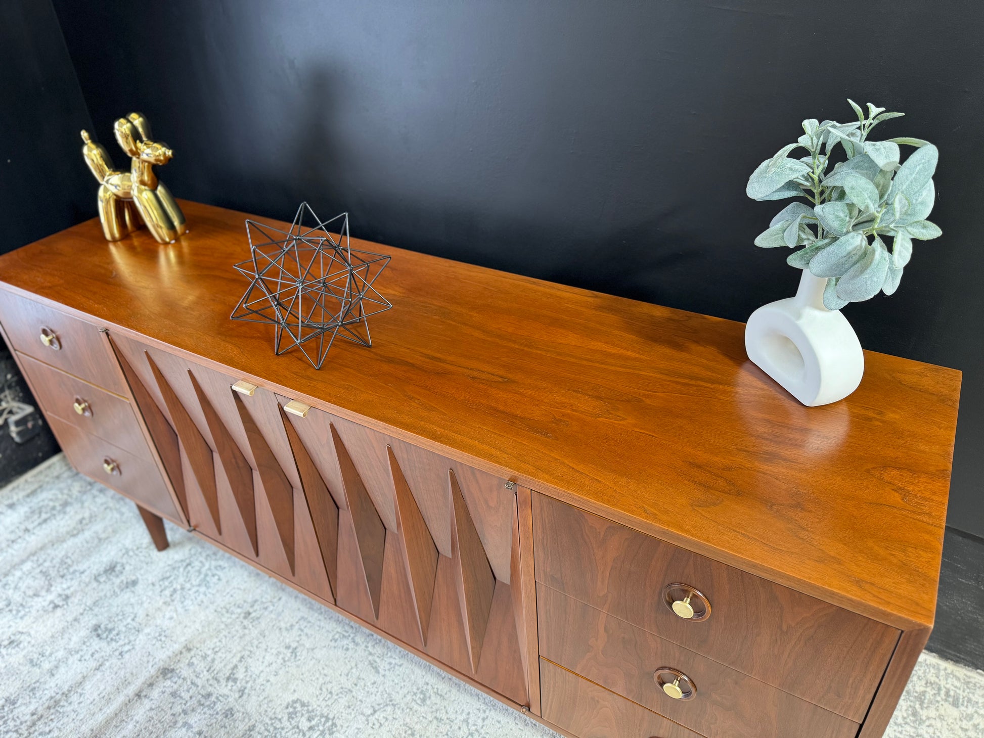 This beautifully restored 9-drawer dresser by American of Martinsville exemplifies the timeless elegance of mid-century modern design. The piece features clean lines, unique harlequin accents, and exceptional craftsmanship that make it both functional and stylish.