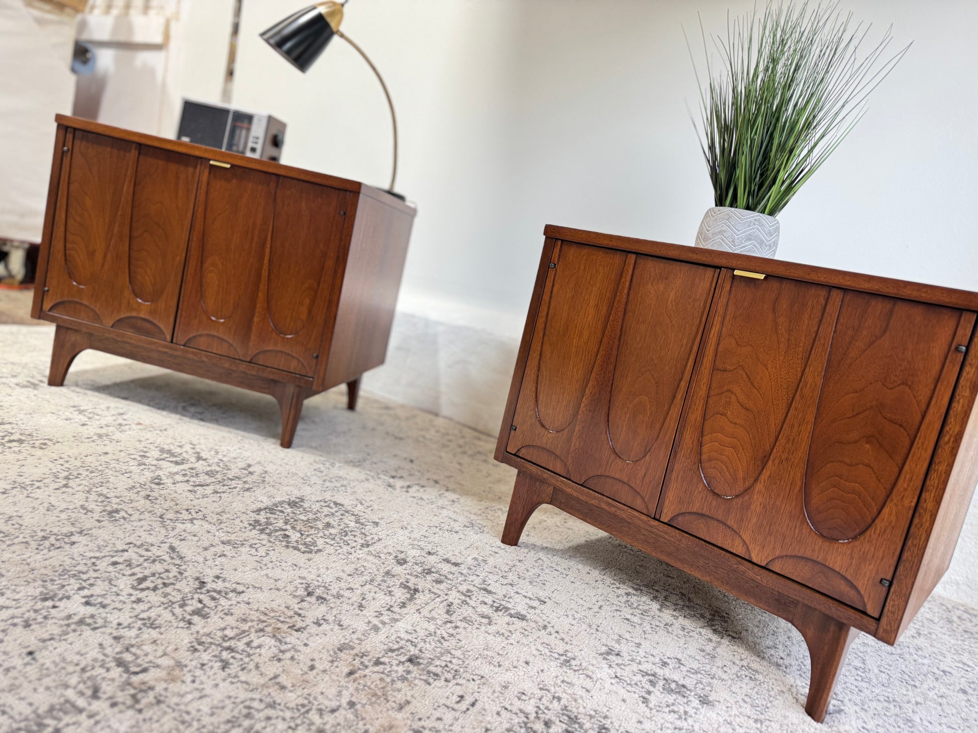 Transform your bedroom with the iconic Broyhill Brasilia Commode Nightstands. Please note photos are stock. We have refinished these on several occasions. If they are not already completed customers can request the tone and even have a bespoke set if they desire.
