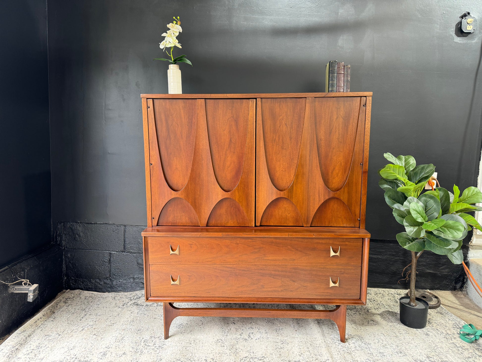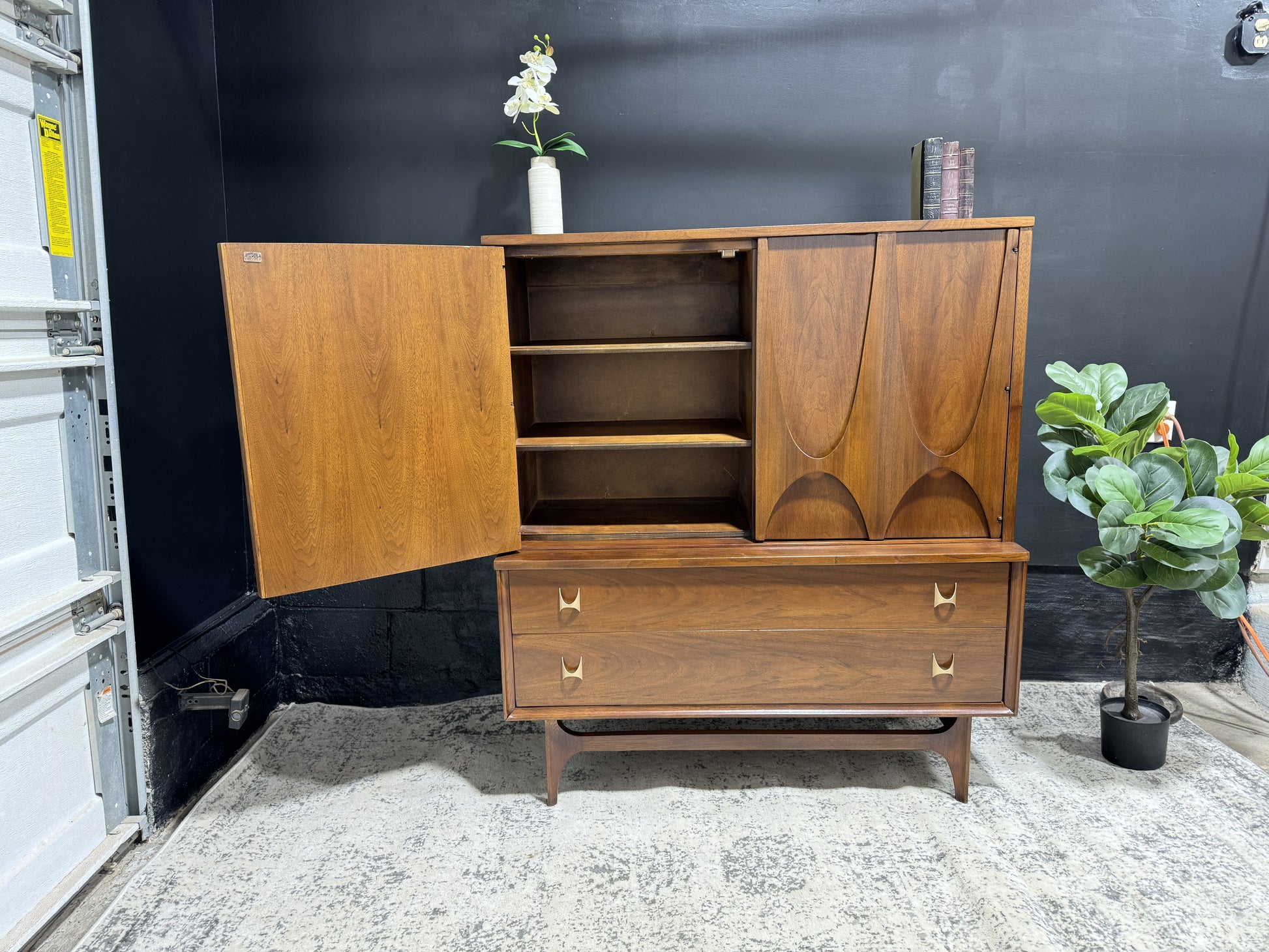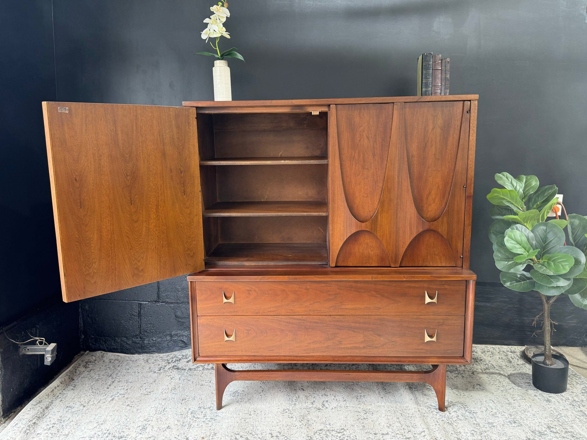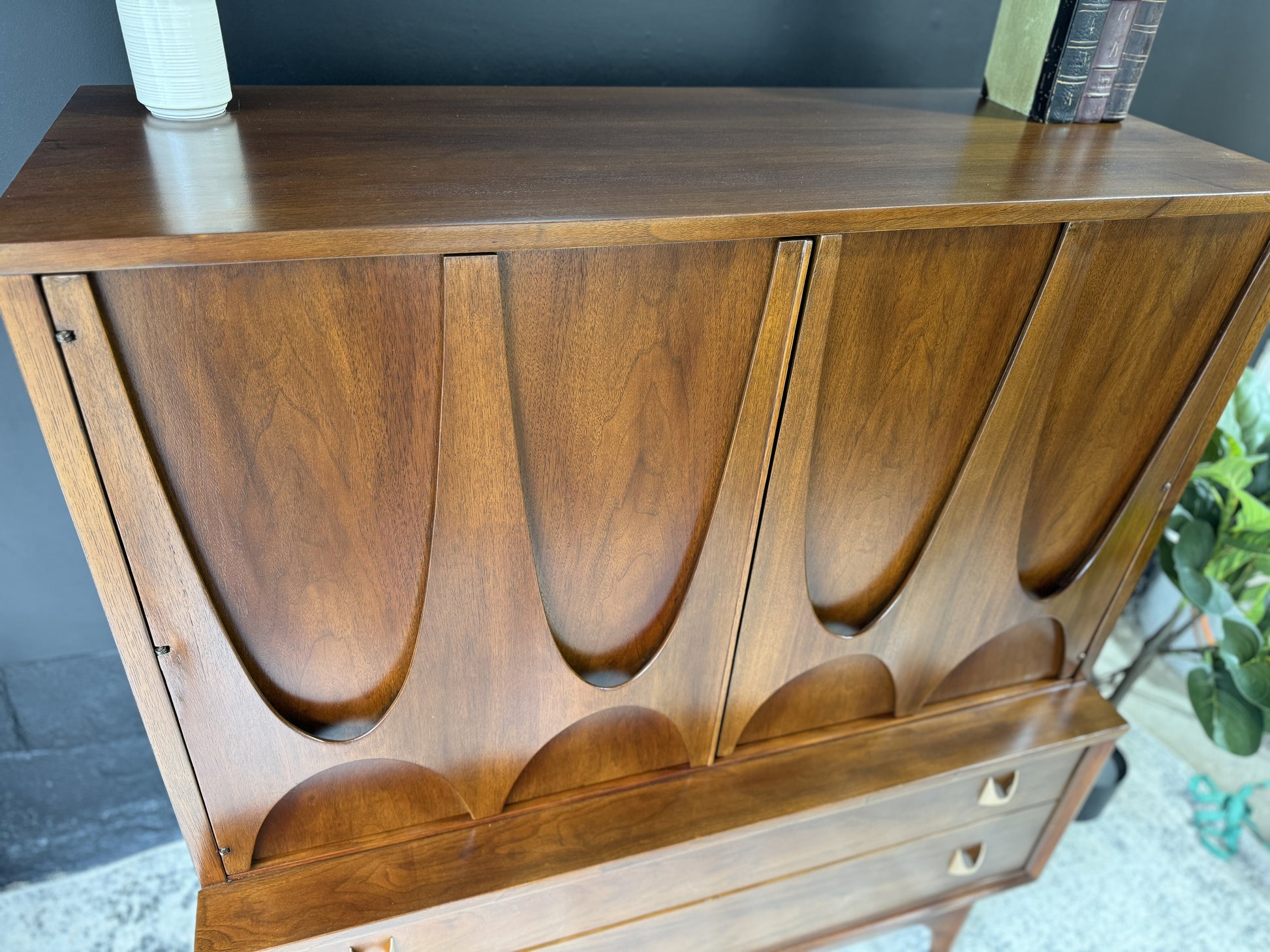 Embrace sophistication with the Broyhill Brasília Gentleman’s Chest – a distinguished blend of style and functionality. Crafted with precision and adorned with the iconic Brasília design, this chest offers ample storage for your wardrobe essentials. The sleek lines and warm wood tones create a timeless appeal, making it a focal point in any bedroom. Elevate your space with this mid-century masterpiece that seamlessly marries form and function.