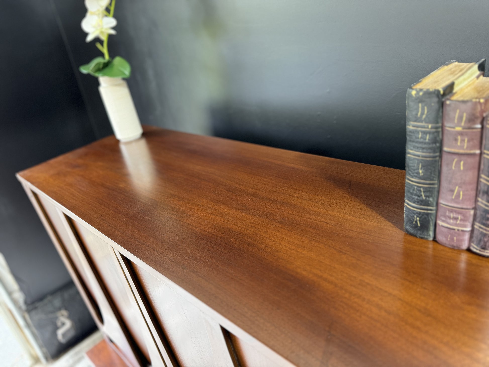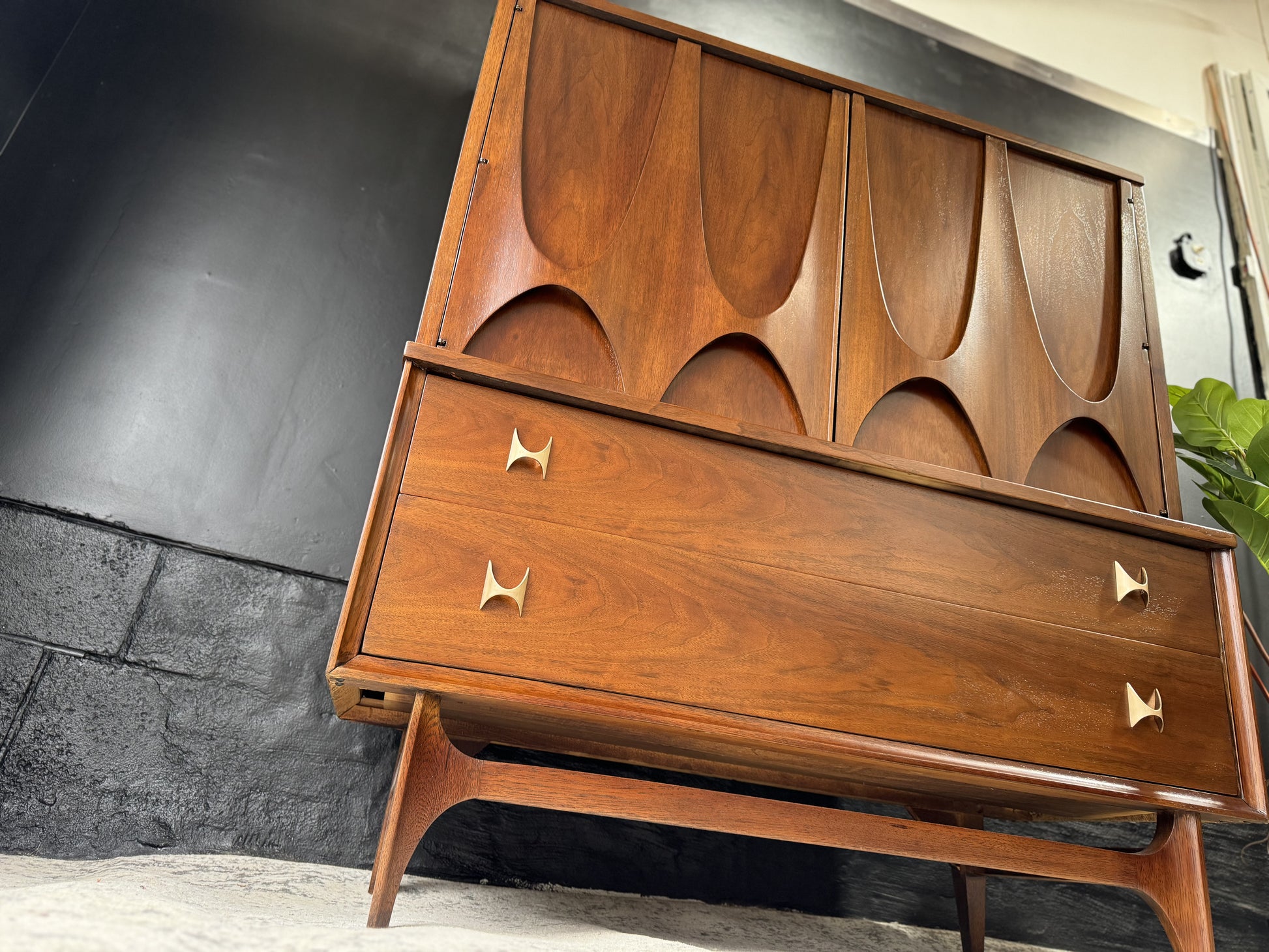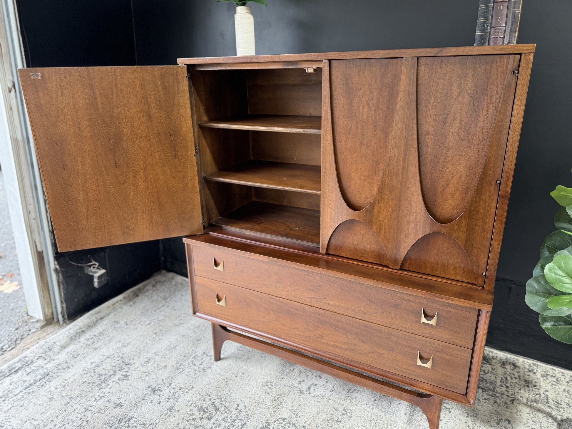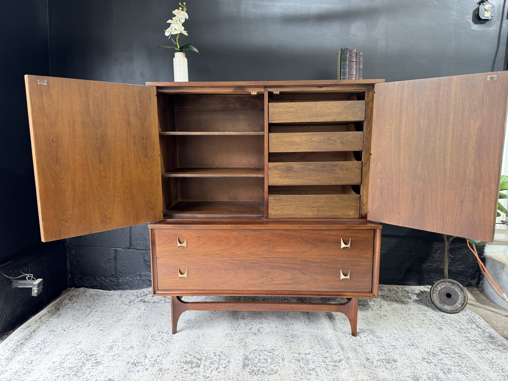 Embrace sophistication with the Broyhill Brasília Gentleman’s Chest – a distinguished blend of style and functionality. Crafted with precision and adorned with the iconic Brasília design, this chest offers ample storage for your wardrobe essentials. The sleek lines and warm wood tones create a timeless appeal, making it a focal point in any bedroom. Elevate your space with this mid-century masterpiece that seamlessly marries form and function.