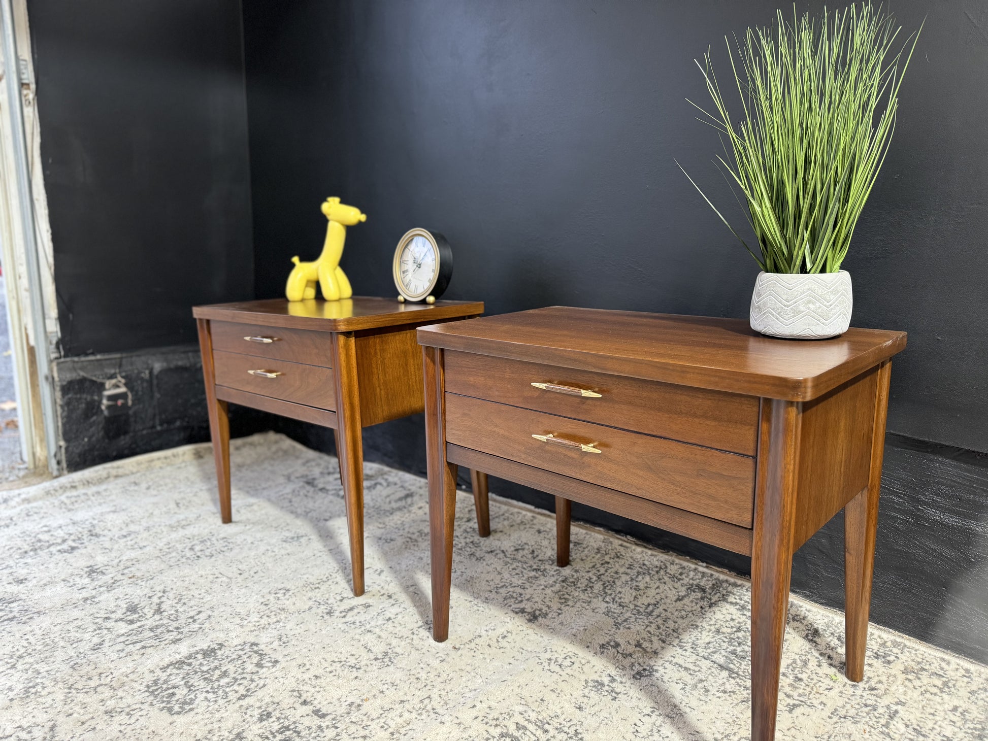 Elevate your space with this stunning pair of Broyhill Saga Nightstands, beautifully refinished to bring out their timeless mid-century charm. Featuring the iconic starburst hardware, meticulously restored with fresh paint and hand-drawn grain details, these nightstands are a perfect blend of vintage craftsmanship and modern sophistication.