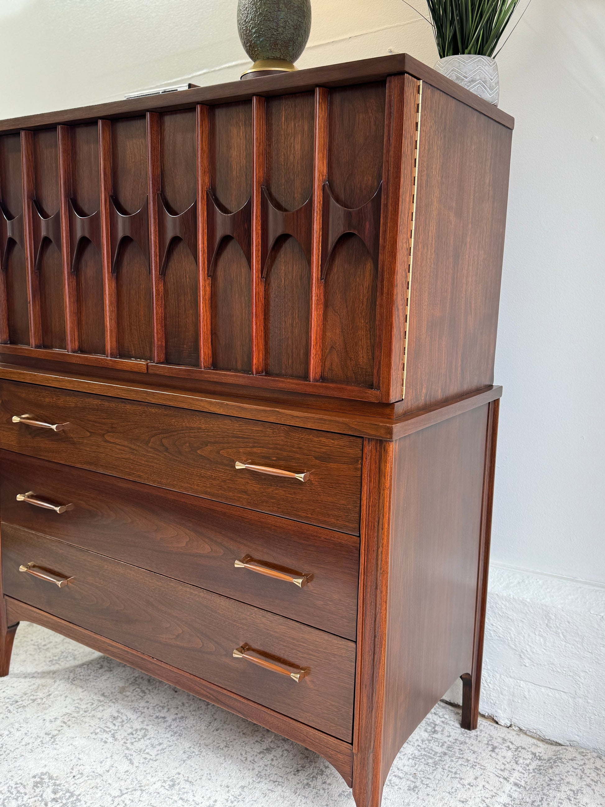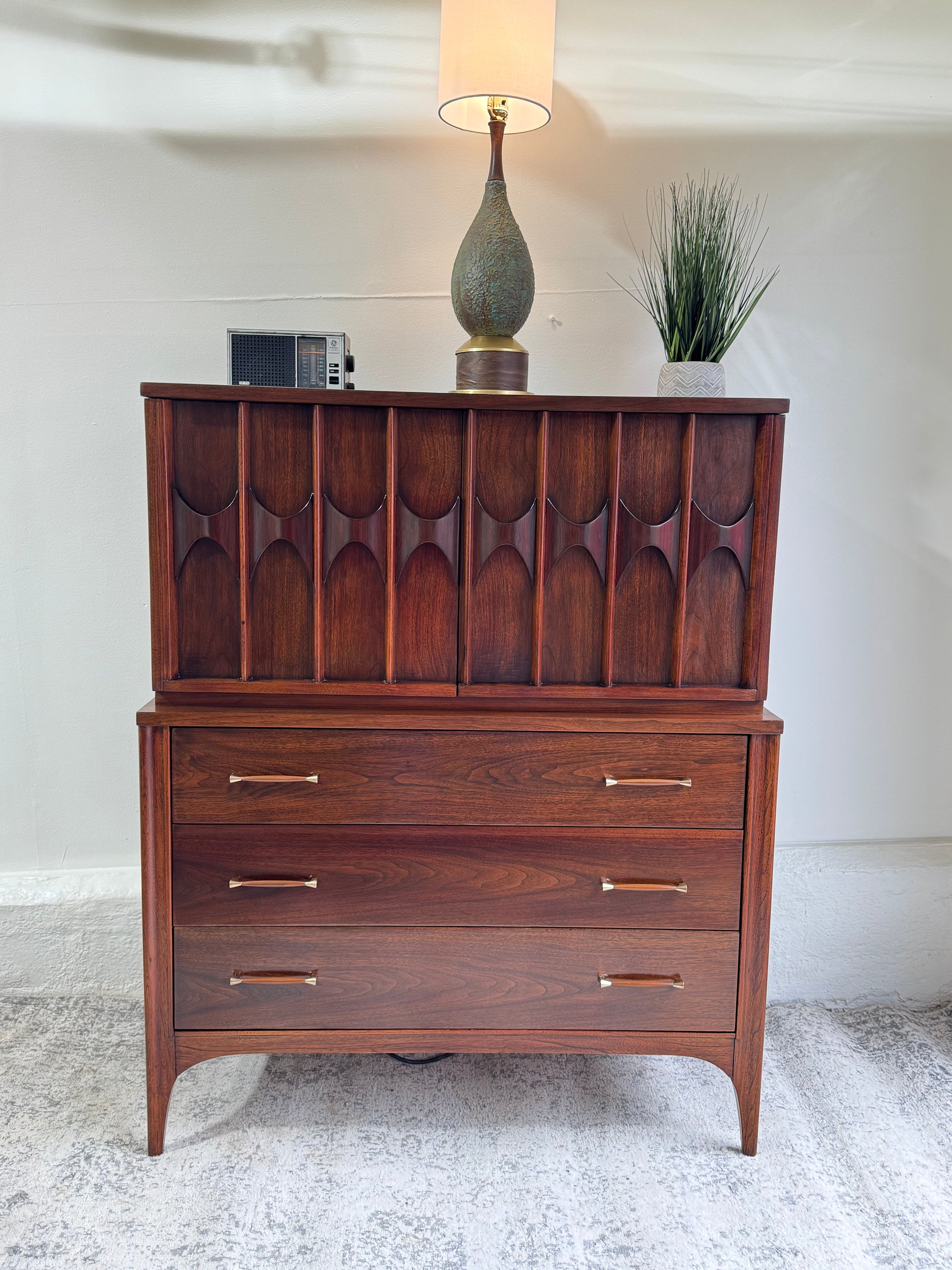 An iconic statement of American midcentury design, this Kent Coffey Perspecta Gentleman’s Chest has been meticulously restored by hand to showcase the elegance and craftsmanship it was originally celebrated for.