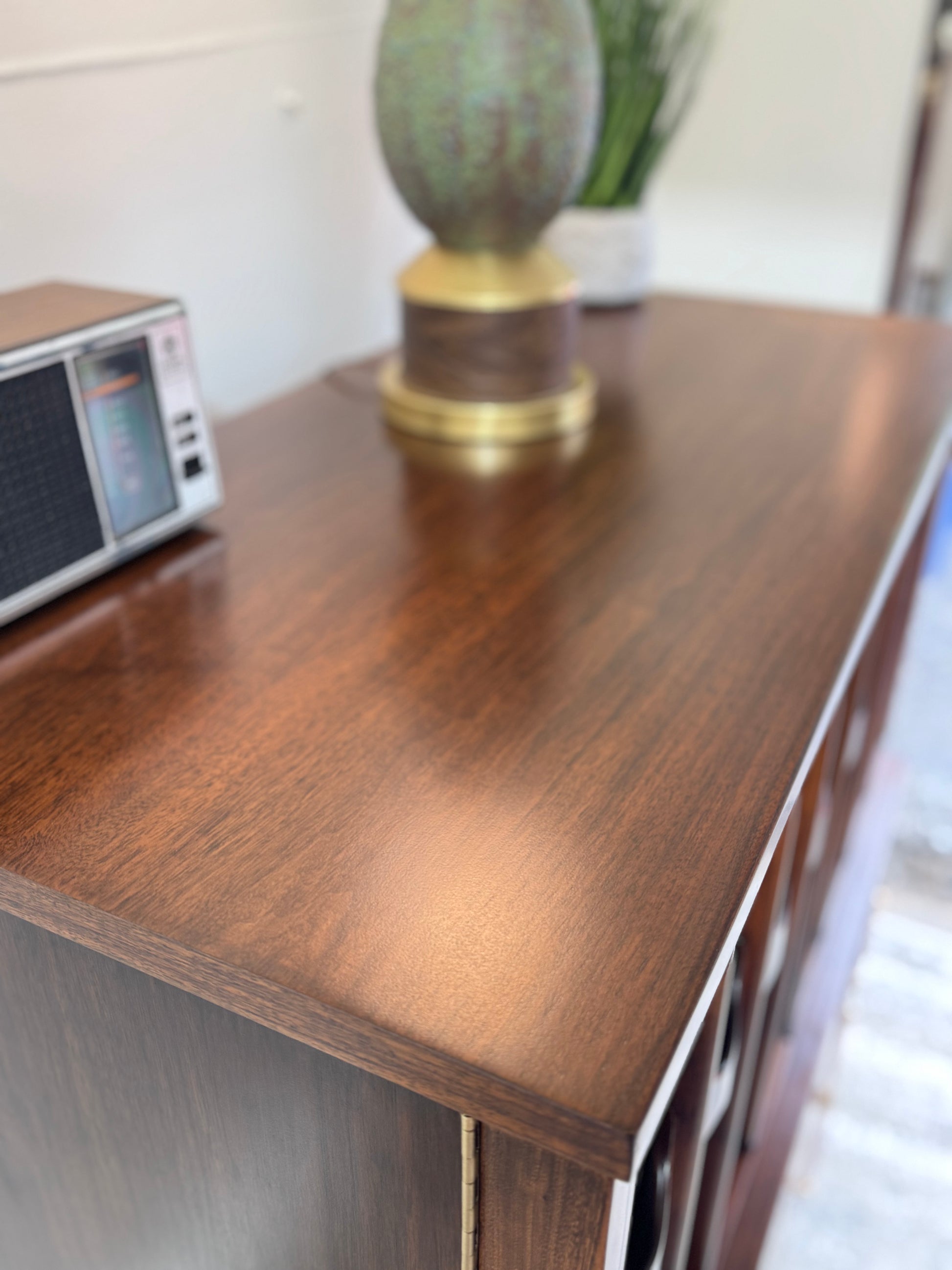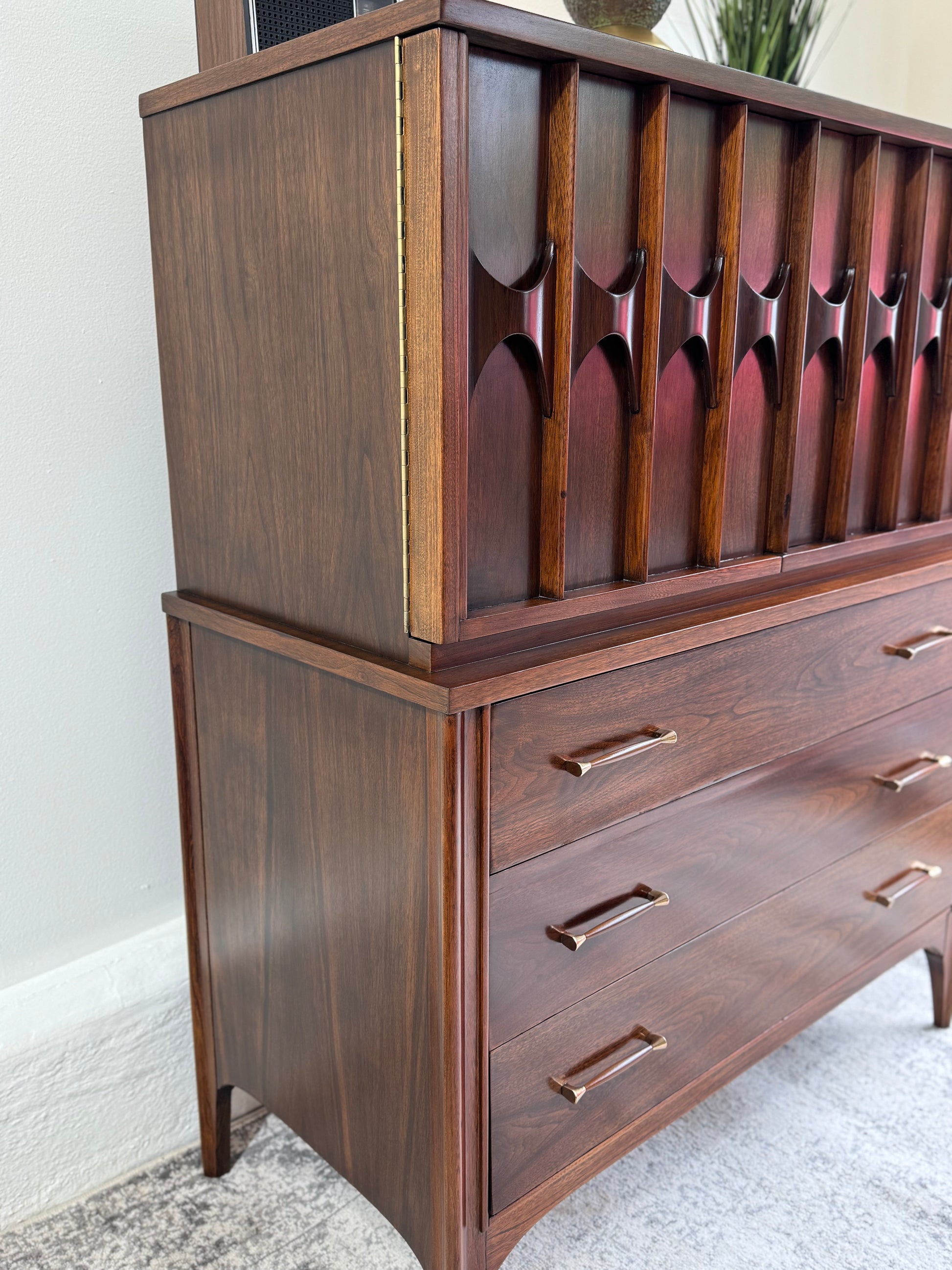 From its sculpted rosewood arches to its nine-drawer layout with integrated shelving, every detail of this piece has been brought back to life using professional-grade methods and materials. The restoration includes: