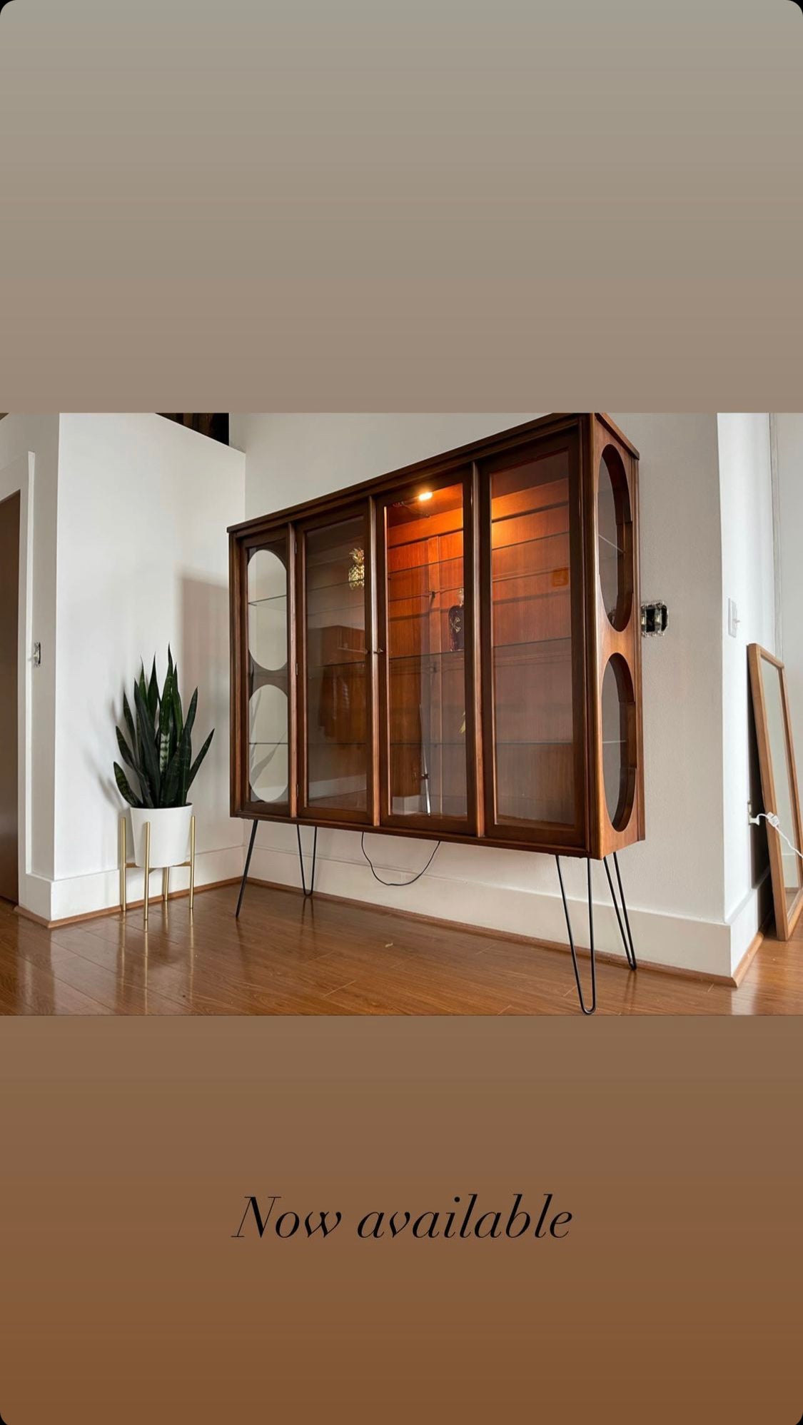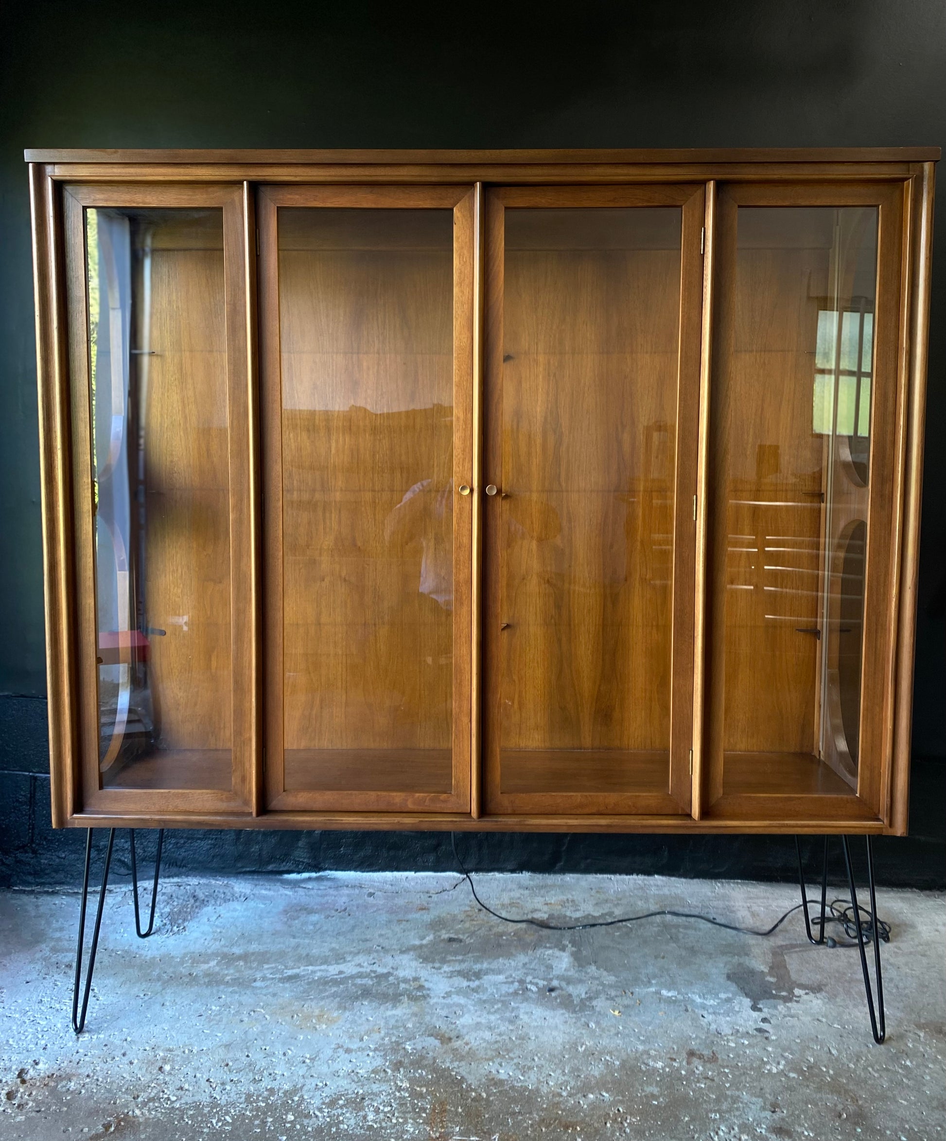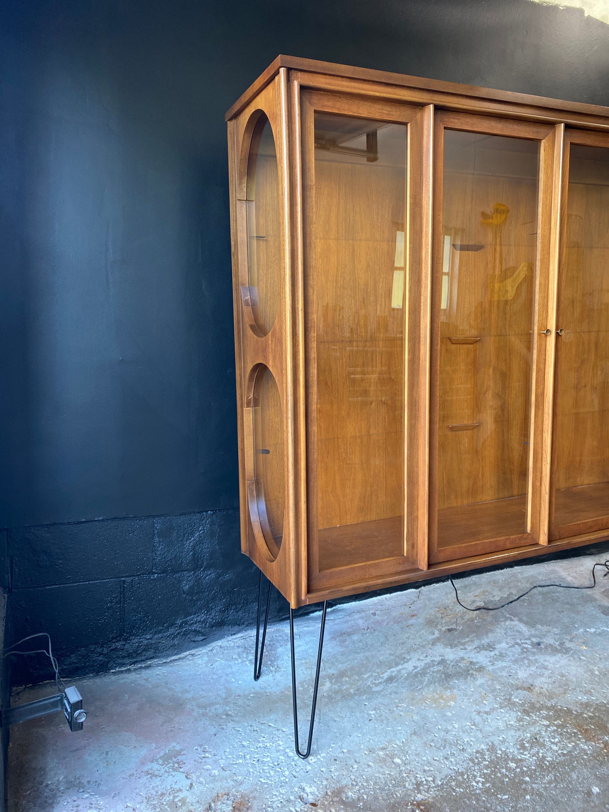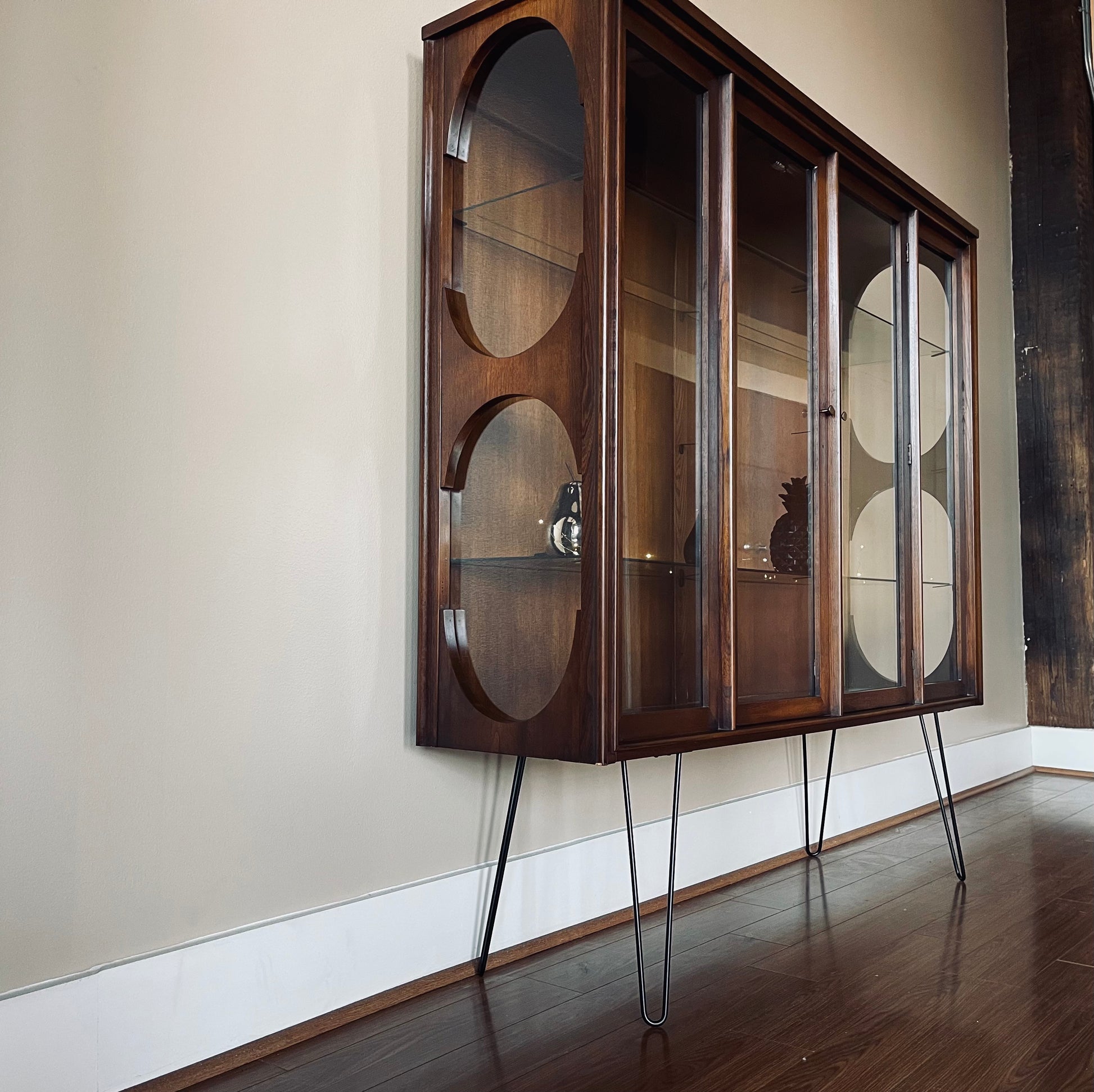 Explore timeless elegance with our Kent Coffey Perspecta glass cabinet, a mid-century masterpiece that seamlessly blends form and function. The distinctive glass oval circles on hairpin legs create a captivating visual appeal, making it a focal point in any space.