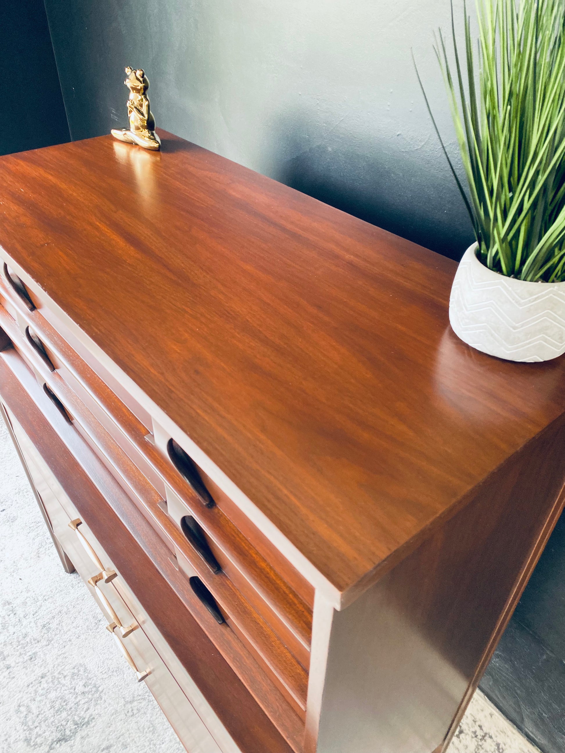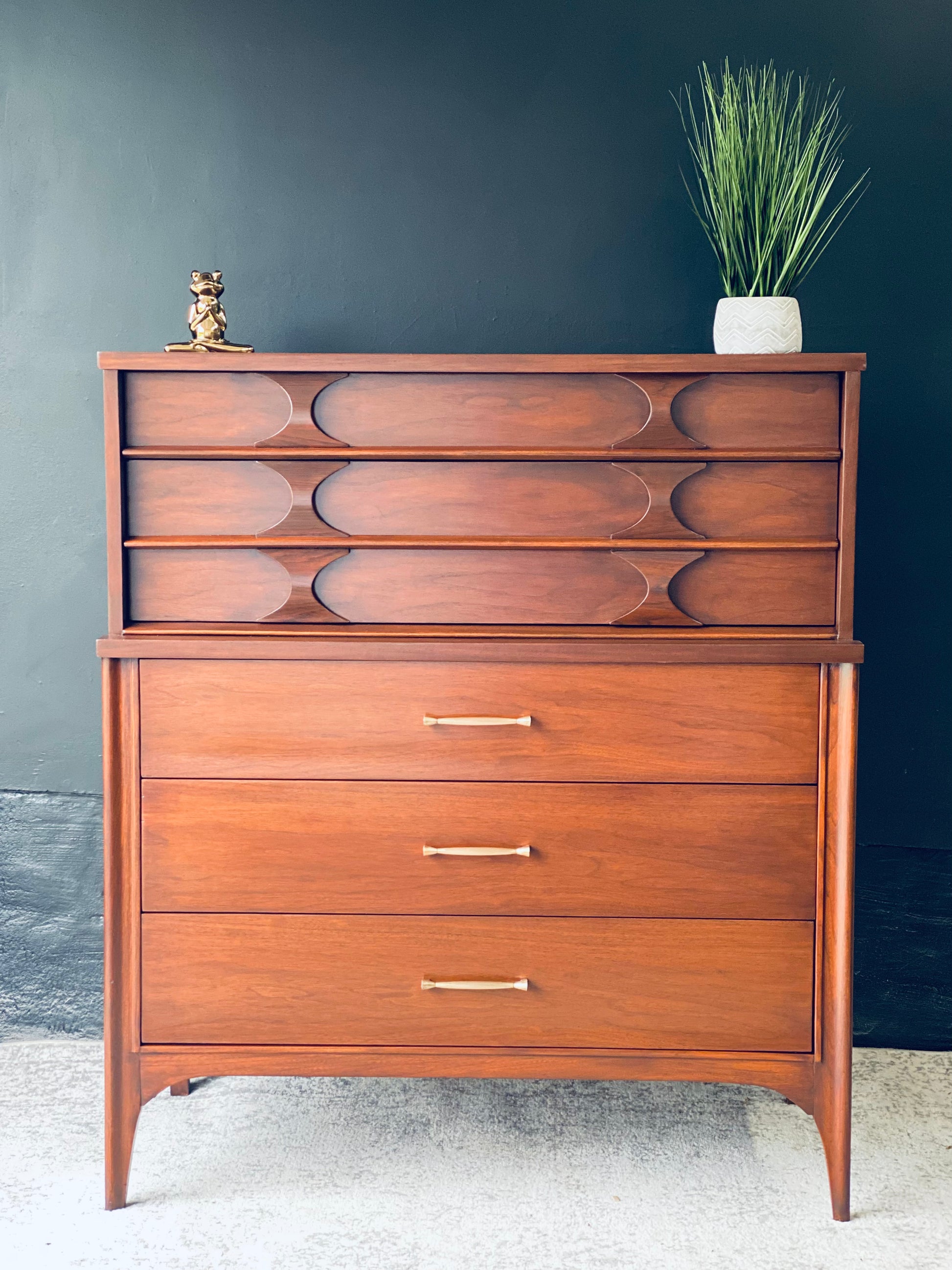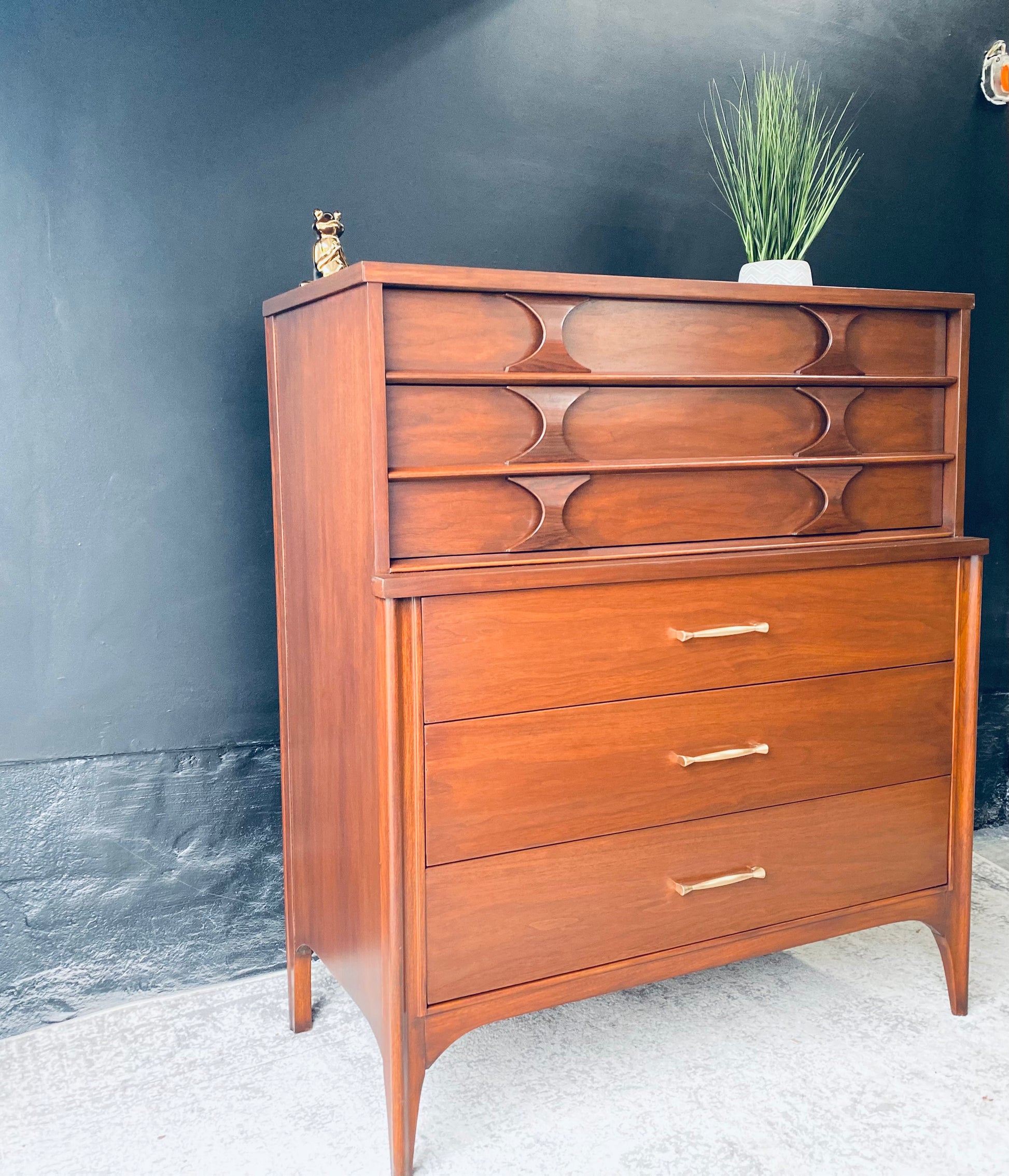 Elevate your bedroom aesthetic with the timeless allure of the Kent Coffey Perspecta Highboy Dresser. Crafted with precision from rich walnut wood, this mid-century masterpiece embodies the iconic Perspecta design. The vertical silhouette of this highboy dresser is adorned with sculpted drawer pulls, offering a perfect blend of style and functionality. With ample storage and a design that transcends trends, this piece adds a touch of vintage sophistication to your living space.