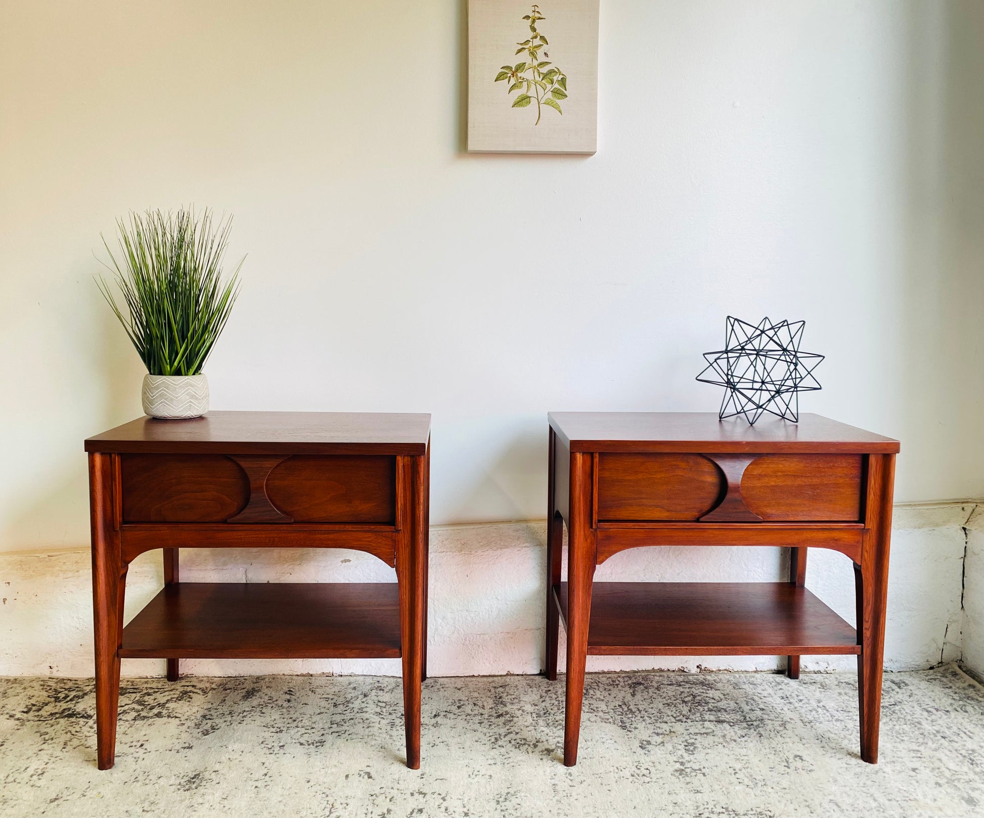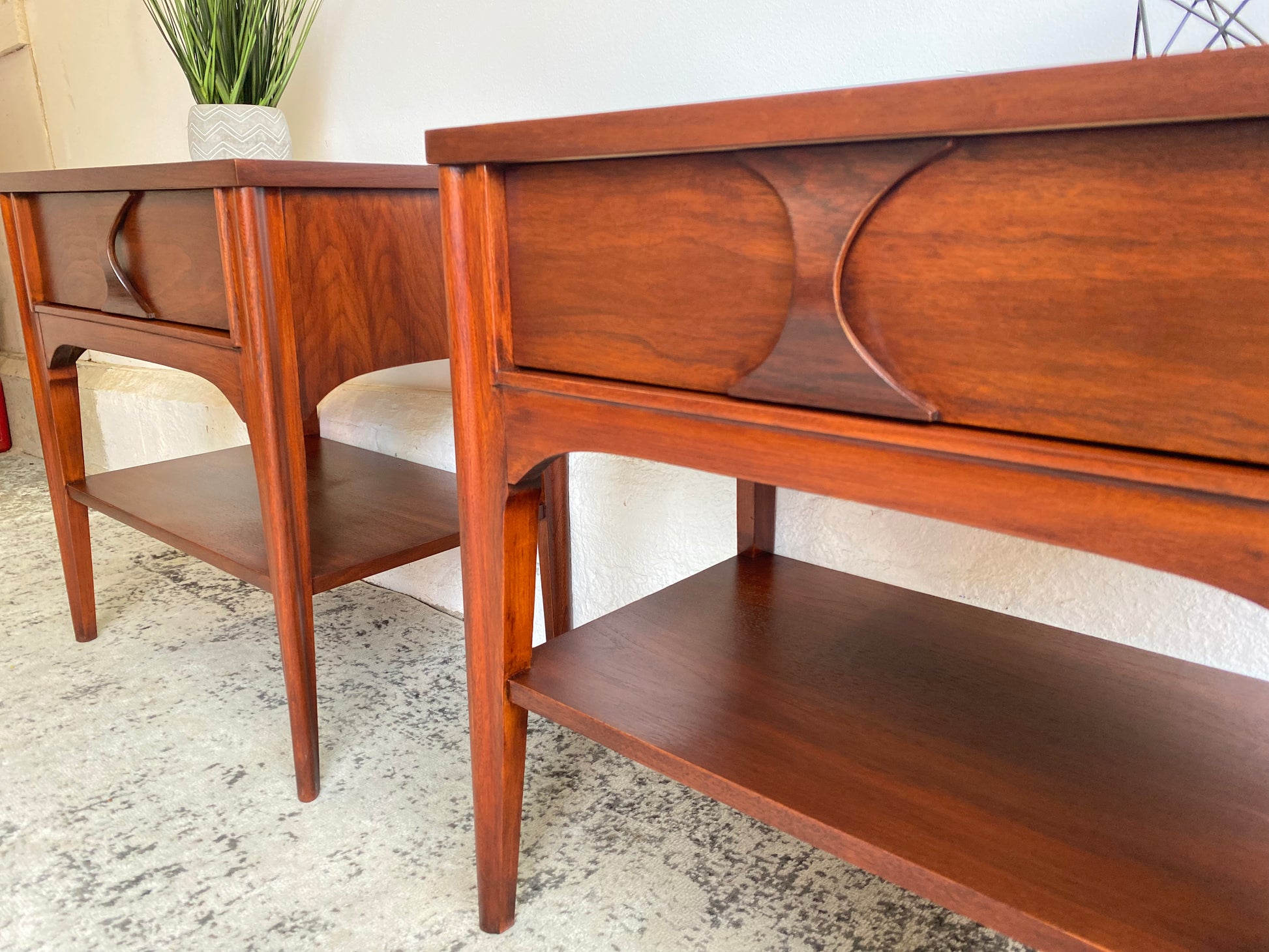 Introducing the epitome of timeless elegance and refined craftsmanship: a pair of exquisitely refinished Kent Coffey Perspecta nightstands. These stunning pieces have been meticulously restored to their original splendor, breathing new life into their mid-century modern charm.