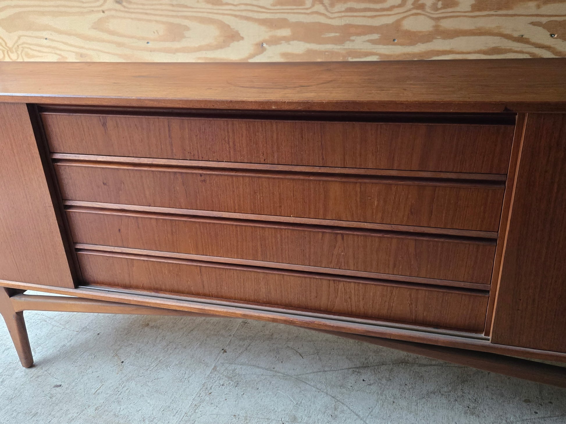 This listing is for a Mid Century Danish teak credenza by Knud Nielsen a classic example of refined Scandinavian modern design. Featuring clean lines warm teak tones and thoughtful proportions this piece offers both functional storage and timeless visual appeal making it an excellent anchor piece for dining living or office spaces.